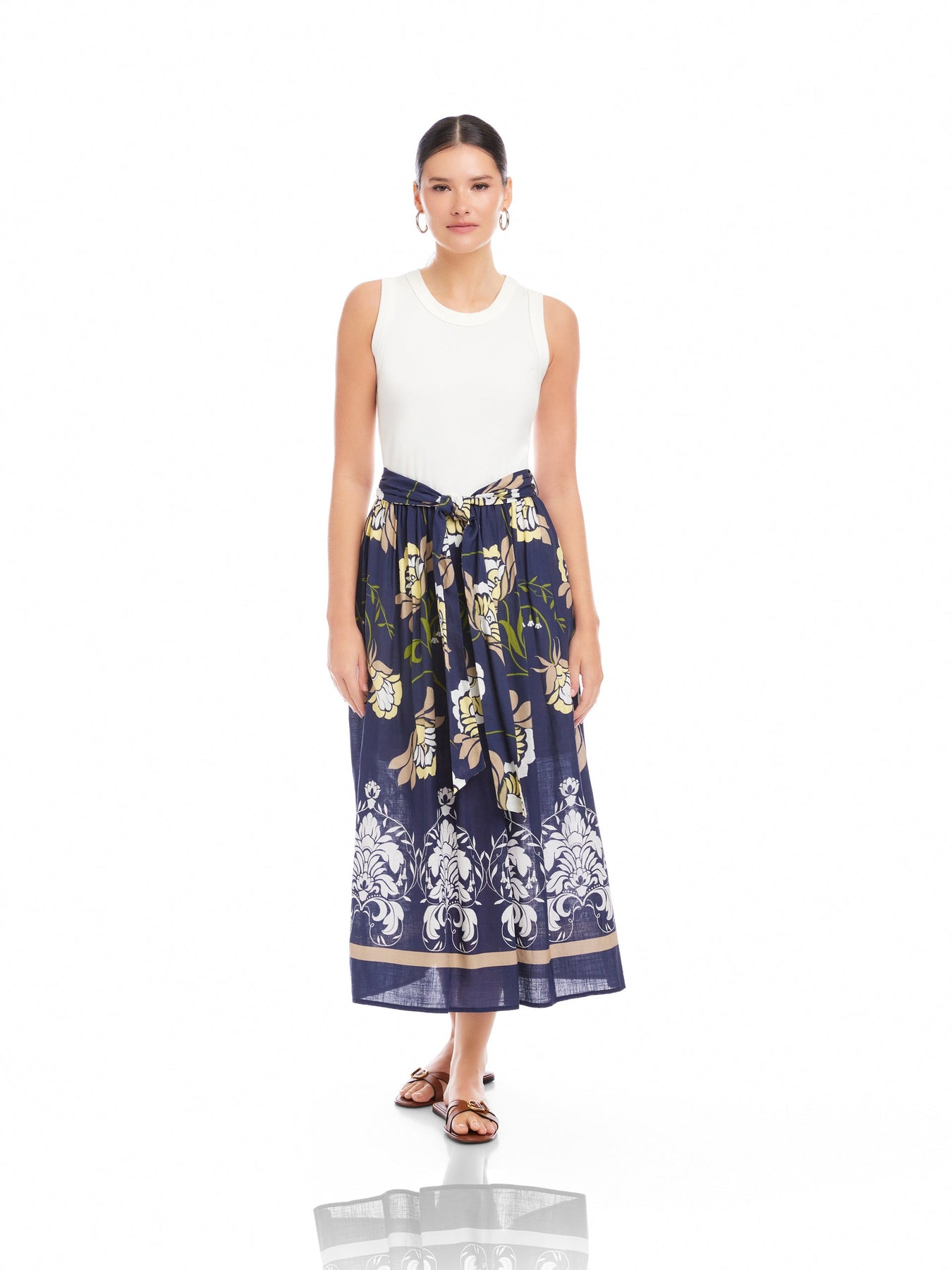Effortlessly feminine with a modern mixed-media design, the Seline Contrast Midi Dress features a soft cotton-modal rib knit bodice paired with a lightweight woven skirt infused with a touch of linen for airy texture and movement. The sleeveless silhouette is finished with a classic crew neckline and a defined waist that flows into a printed midi skirt, creating a balanced blend of comfort and refined detail for an elevated everyday look.