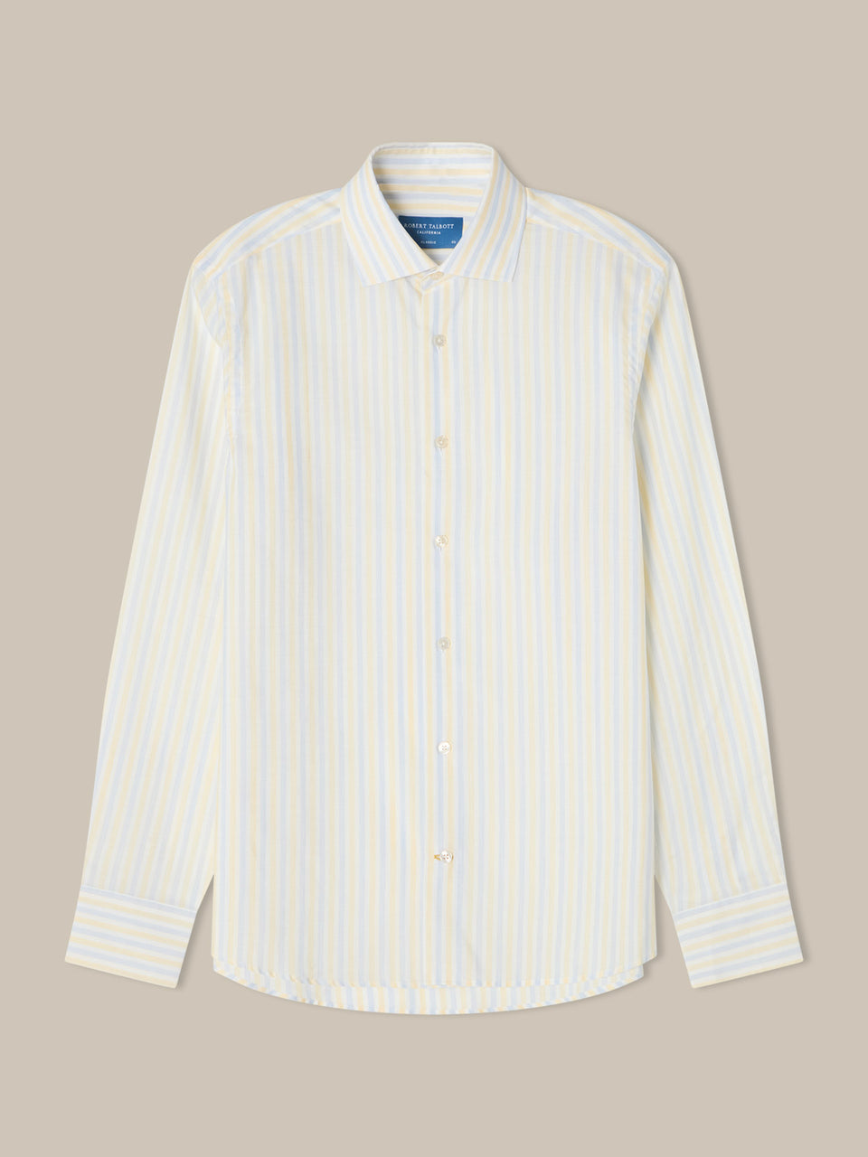 Designed for warmer days, this shirt is cut from fine Italian cotton–linen fabric with a light, breathable feel and a clean drape. A fine multi-stripe pattern adds visual interest without overwhelming the look. Tailoring details include a semi-spread Monterey collar, French placket, and single-needle construction, along with a rotated armhole for ease of movement. Finished with subtle Talbott gold details at the inside neck and buttonholes.